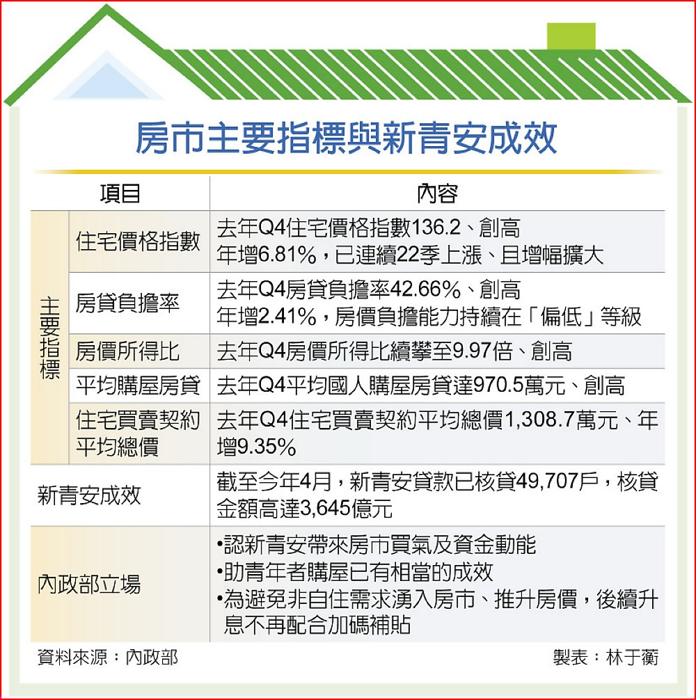 隨《平均地權條例》修法上路打炒房即將滿一年,但當前房貸負擔率、房價所得比、住宅價格及租金指數4大指標全數創歷史新高,對新青安貸款推升房市交易需求,內政部終於開第一槍「喊停」,表態後續新青安不宜再配合升息加碼補貼。