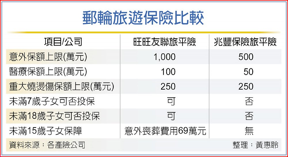 兆豐郵輪綜合險含旅遊不便險,包括旅程取消費用補償、旅程更改費用、旅行文件損失費用、醫療等保障。兆豐保險表示,民眾只要在出發前透過網路投保,即可享有海外急難救助醫療轉送最高新台幣300萬元保障。