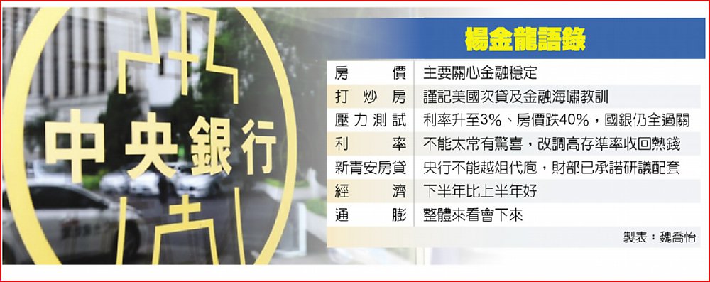 楊金龍說明,即使通膨率下來,但這次會議中部份理事還是緊盯通膨議題,主要是擔憂房租負擔,因房租與房價有關,房價上漲就會帶動租金,但CPI還是要看整體,即便房租上漲,其他部份下來,結果還是會下修整體CPI及核心CPI,預估下半年都會低於2%,分別為1.98%以及1.93%。