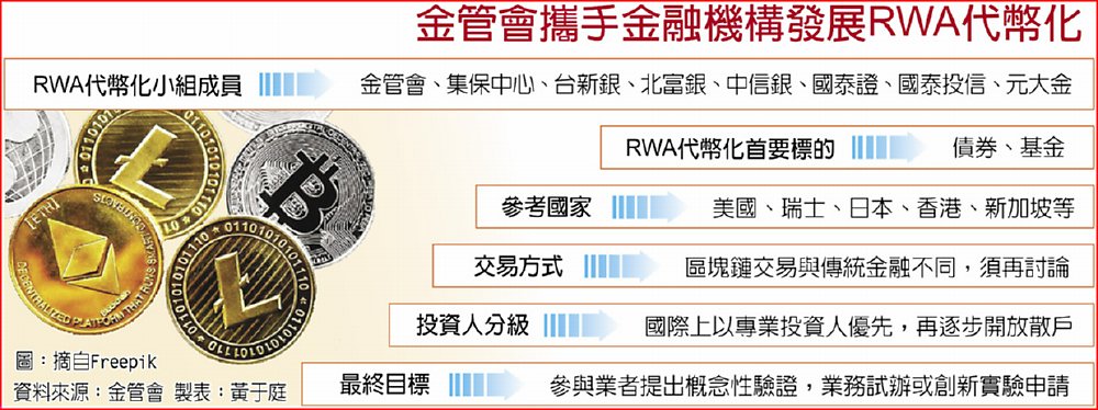 由金管會與金融科技共創平台召集人集保結算所,加上台新銀、台北富邦銀、中信銀、國泰證券、國泰投信及元大金控等六家金融機構,組成RWA代幣化小組,將三到四週開一次會,研議化幣化方式、資產保管、交易模式等,並會討論法規調整、可參與投資人等。