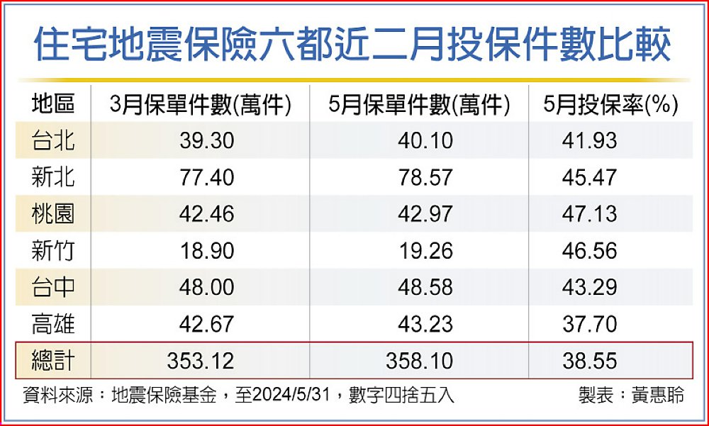 近二個月投保件數增加最多仍集中在都會區,包括新北市、桃園、新竹、台中、台北及高雄等,六都在5月底時投保總件數約272.71萬件,較3月底的268.73萬件約多3.98萬件,且六都中除高雄投保率37.7%、低於全台平均值38.55%外,其他五都投保率都已逾41.9%。投保率最高是桃園的47.13%,其次是新竹地區的46.56%,因這兩區新建案多、房貸戶也多,拉高投保率,然各地區住宅地震險5月底投保件數及投保率都來到歷史新高。