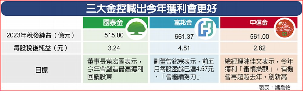 中信金控14日股東會由董事長顏文隆主持,副董事長吳一揆就任後首度露面,中信金總經理陳佳文指出,2023年金控稅後純益561億元、年成長79%,ROE14.64%是金控第一,前五月ROE更達17%,是否能維持要看股匯市狀況,雖沒把握,但會努力,前五月稅後純益已達312億元、年增58%,對今年獲利「審慎樂觀」,有機會再超越去年創新高。