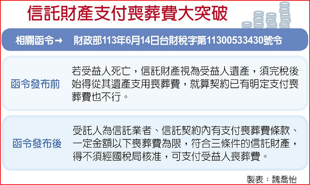 這次鬆綁後,未來有類似需求者,將可依據財政部113年6月14日的函令辦理,在信託契約中作相關約定。以一定金額以下喪葬費為限、以受託人為信託業者為限、信託契約內應包括有支付喪葬費條款的信託財產,得不須經國稅局核准,支付受益人喪葬費。據財政部依遺產及贈與稅法第12條之1規定,113年度遺產稅有六項扣除額及二項不計入遺產總額金額,其中就包括喪葬費138萬元。