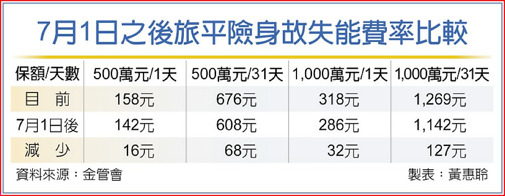 產險業者表示,因各保險公司旅平險中死亡及失能的損率並不高,金管會日前已公告自7月1日起新保險費率,如保額1,000萬元、5天保費是538元、31日保費是1,142元和目前保費比較5日是598元、31日為1,269元,明顯可以看出7月1日有關於旅平險中身故及失能保費有略降一些。