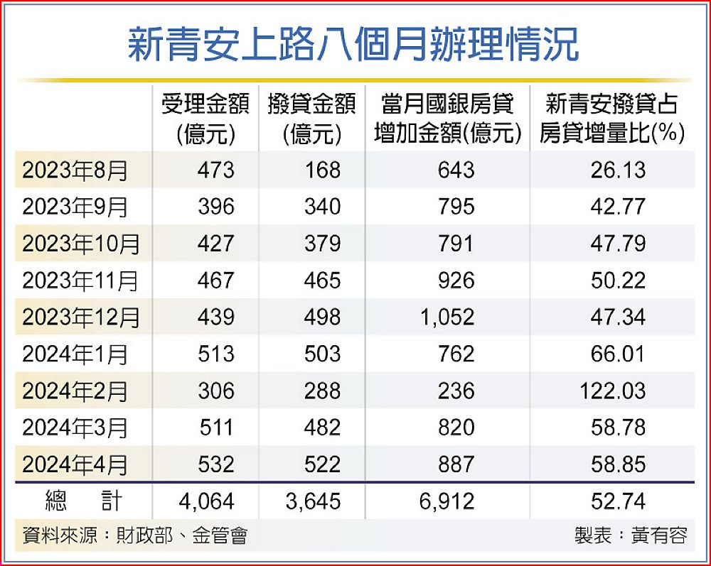 據財政部統計,從去年8月到今年4月,新青安房貸申貸量已逾4千億元,核貸逾3,645億元,同時間金管會公布的國銀房貸增加6,912億元,等於新青安核貸金額就占房貸增量近53%,且除去年8月核貸不及,之後每月核貸占比都有4~6成,今年2月更逾1倍,即新青安的確是國銀房貸成長的主力。