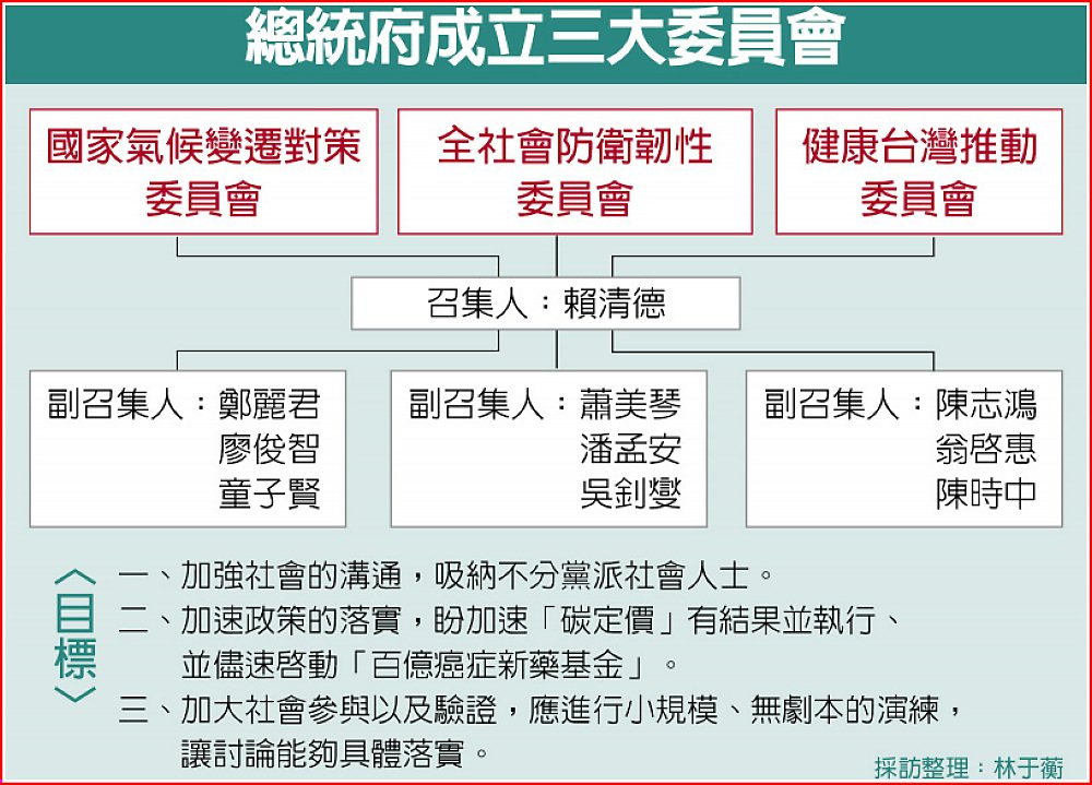 賴清德在就職滿月記者會中宣布,總統府將成立「國家氣候變遷對策委員會」、「全社會防衛韌性委員會」及「健康台灣推動委員會」三大委員會,由他擔任召集人、每季舉行會議。三大委員會設下三大目標:一、加強社會的溝通,吸納不分黨派社會人士;二、加速政策的落實,盼加速「碳定價」有結果並執行,並儘速啟動「百億癌症新藥基金」;三、加大社會參與以及驗證。