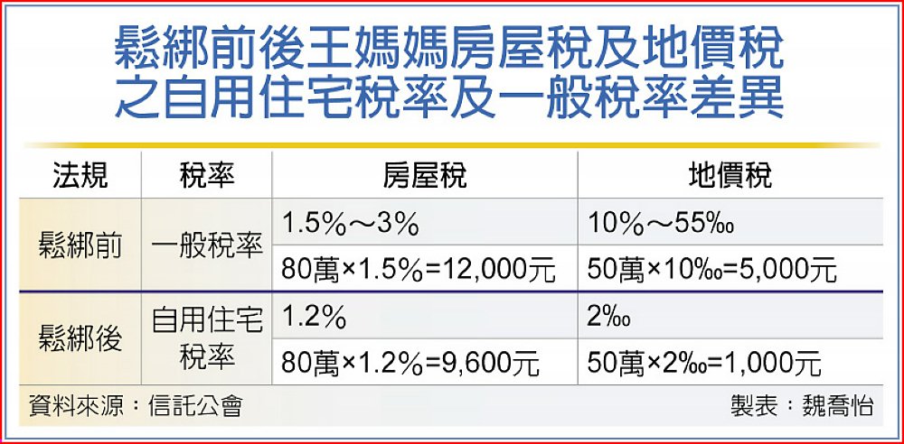 鬆綁前後王媽媽房屋稅及地價稅 之自用住宅稅率及一般稅率差異