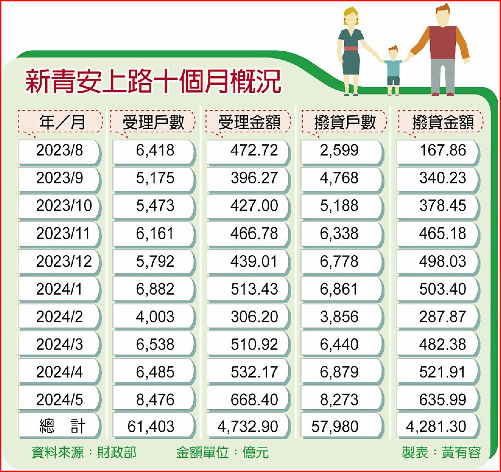 據財政部統計,新青安房貸從去年8月上路後,受理及撥貸戶數、金額皆維持在相對高水準,5月單月受理戶數8,476戶、受理金額668.4億元;單月撥貸戶數和金額分別為8,273戶、635.99億元,四項統計數字都是去年8月以來單月新高,且遠超今年1月及4月高點的6,800多戶、500多億元水準。到5月底,新青安總受理戶數突破6萬戶,達61,403戶,總受理金額4,732.9億元。撥貸方面,已有5萬7,980戶透過新青安取得優惠房貸利率,累計撥貸4,281.3億元。