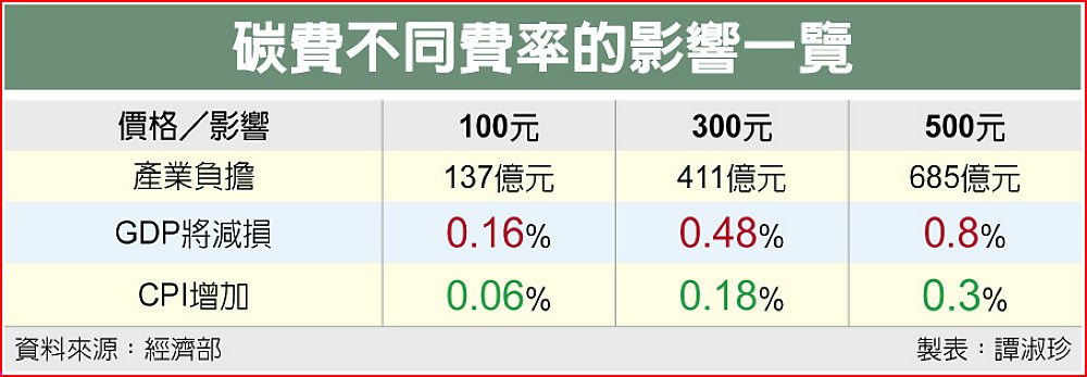 經濟部強調,這項分析只是為瞭解對經濟、產業衝擊所做初步推估,最終還是要以環境部2024年的排碳量為準。據經濟部初步推估,不同情境的費率,產業將負擔約137億元~685億元,對總體經濟面而言,對GDP約減損0.16~0.8%,CPI則增加0.06~0.3%。