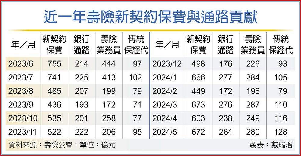 保經代通路前五月新契約保費收入達538億元,較去年同期422億元、年增高達27%,前五個月有4個月賣破百億元,尤其5月賣128億元的史上單月新高,貢獻壽險新契約保費占比從過往不到1成,5月已拉高到近2成的19%;前五月傳統保經代主要銷售投資型保單、近319億元,賣贏銀行通路。
