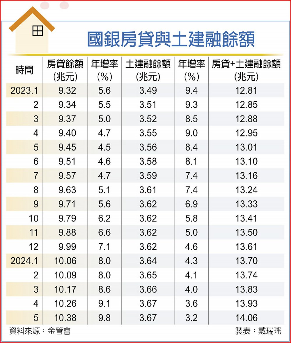 相較民眾買房申貸熱潮,5月國銀建築融資僅增15億元,年增3.2%,已連九個月下降,餘額達3.67兆元,國銀房貸加建融餘額5月正式突破14兆元,達14兆557億元,亦是新高。