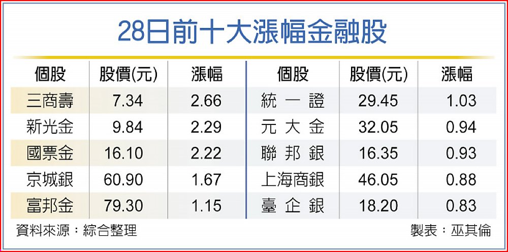 觀察金融股28日漲幅前十大,三商壽上漲2.66%最強,其次為新光金上漲2.29%、國票金漲2.22%。其他如京城銀、富邦金、統一證單日漲幅均逾1%,元大金、聯邦銀、上海商銀、臺企銀漲幅介於0.83%~0.94%。
