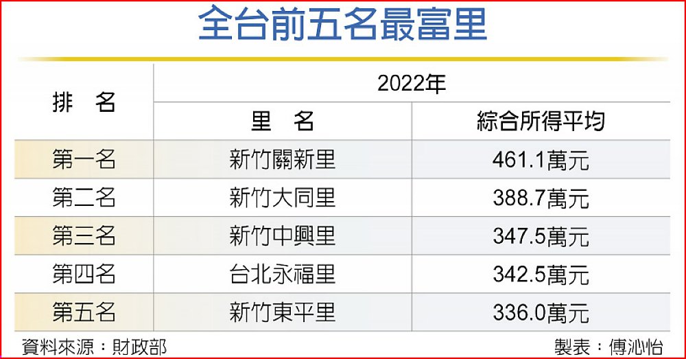 2022年全台最富里第一和第二都是新竹市,冠軍關新里綜合所得收入平均461.1億元,遙遙領先也突破自身紀錄,全里等於較前一年再「加薪」23%;第二名的大同里是首度闖進前五名,平均收入自前一年的177.9萬元爆增至388.7萬元。