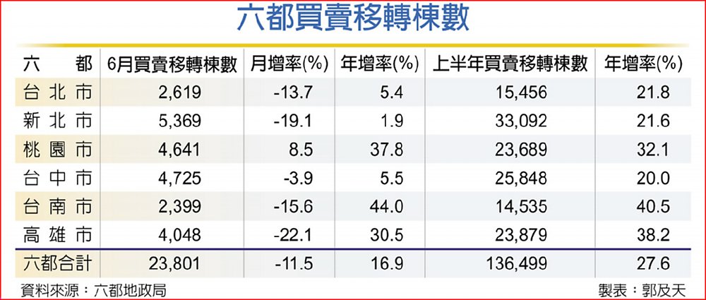 第二季六都買賣移轉7.36萬棟、年增17%;累計上半年買賣移轉13.65萬棟、年增28%。以上半年來看,台南年逾4成、高雄年增近4成,顯示南台灣買氣熱絡,其餘四都的年增率也都在2成以上,台北市創下近十年來最高,桃園為近11年新高,台中為近13年新高,台南及高雄則分別創下歷史最高及次高紀錄。