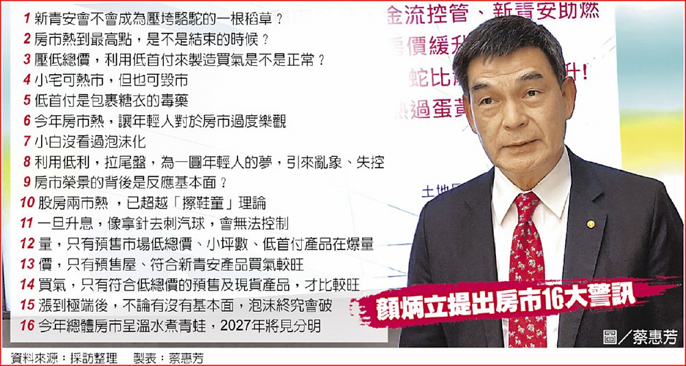 顏炳立也提出「新青安貸政策是否成為壓垮駱駝的一根稻草」等16大警訊,並且直言「2024年房市呈溫水煮青蛙,2027年這一波預售屋買氣熱潮要完工交屋時,將見分明」。