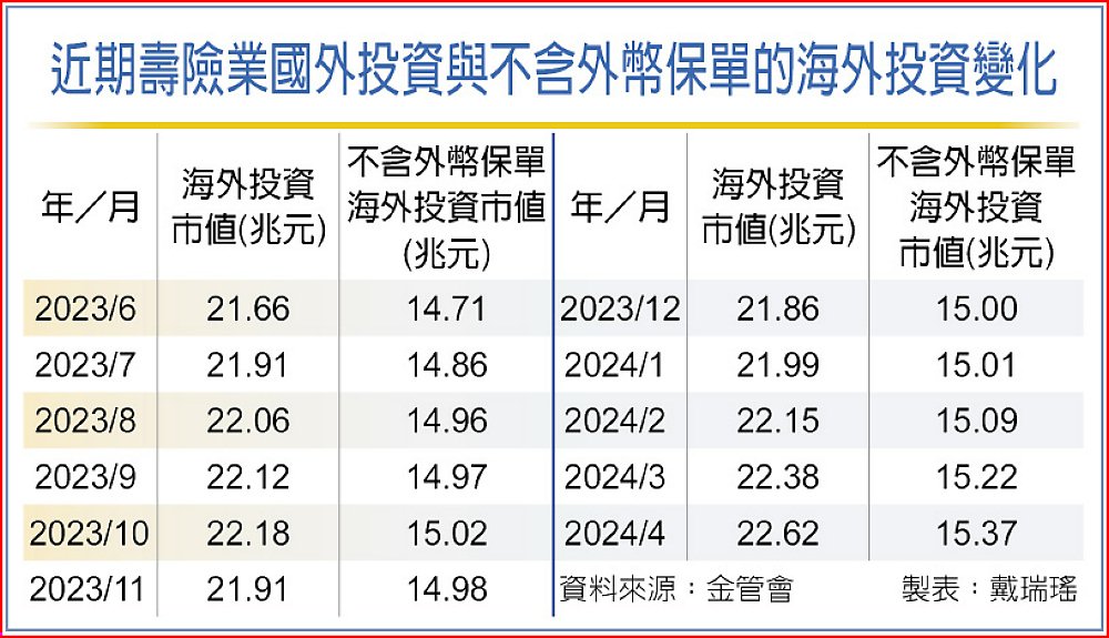 去年壽險海外投資只增6,698億元,較2021年、2022年一年增1兆元以上,增速明顯放緩,不計外幣保單的海外投資金額去年也僅增4,532億元,比2021年、2022年少許多,主要有三因素,一是台美利差大,避險成本高漲;二是避險貴,壽險業多轉投新台幣計價的美債ETF,節省避險支出;三是解約率升高,壽險面臨現金流壓力,投資資金減少。