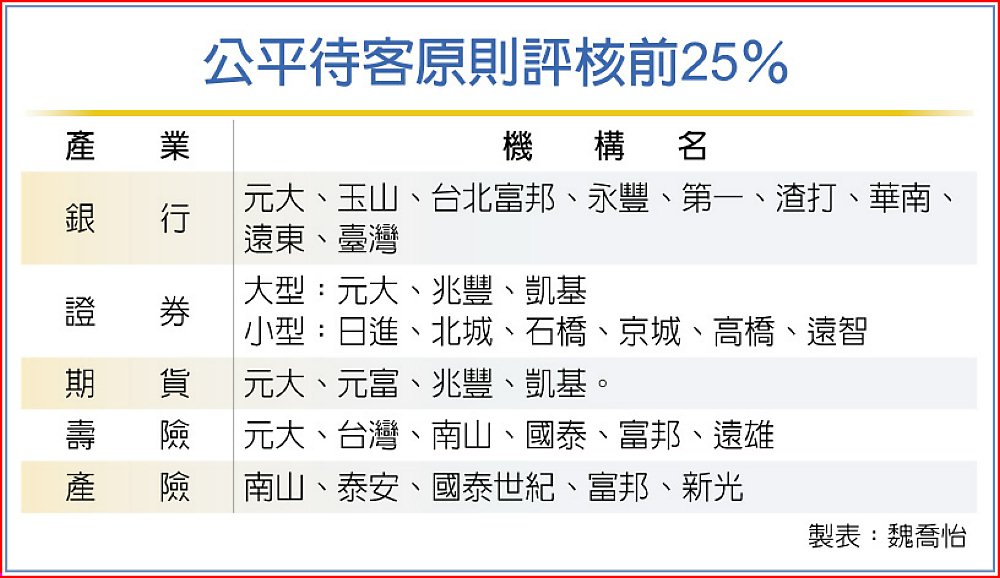 待客如親。金管會2日公布2024年公平待客評核結果,今年是第六屆,其中有十家從2022至2024年連續三年名列前25%。圖/本報資料照片
