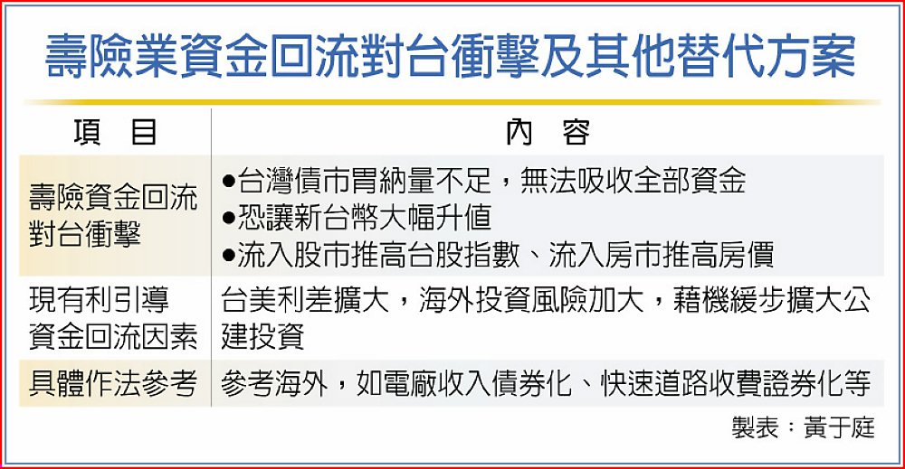 同時大量資金回台有三大不利,一是台灣債市規模胃納量不足,壽險資金無法投資足額的固定收益標的,二是大量資金匯回可能使新台幣快速升值,三資金若流入股市或不動產市場,可能造成資本市場、不動產市場劇烈波動;另一方面,央行亦強調,台灣是經常帳順差的國家,應讓資金適度投資海外,平衡國內經濟。