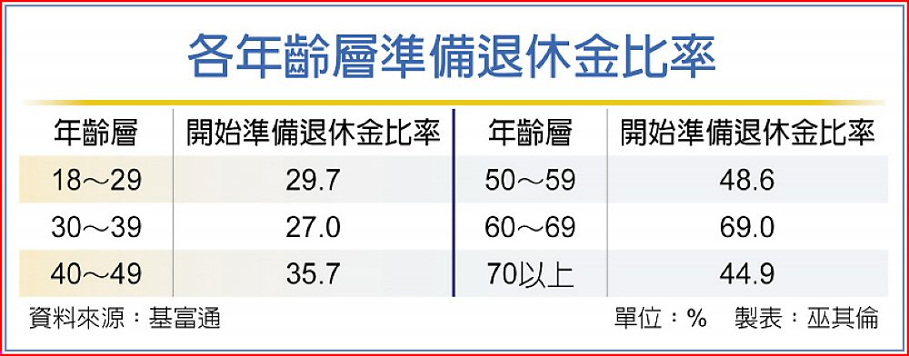 就各年齡層準備退休金觀察,40歲以下族群均低於3成,18~29歲僅29.7%、30~39歲27%;40~49歲35.7%、50~59歲48.6%、60~69歲有69%、70歲以上44.9%,越晚準備退休者,對退休金達標的信心也越低。