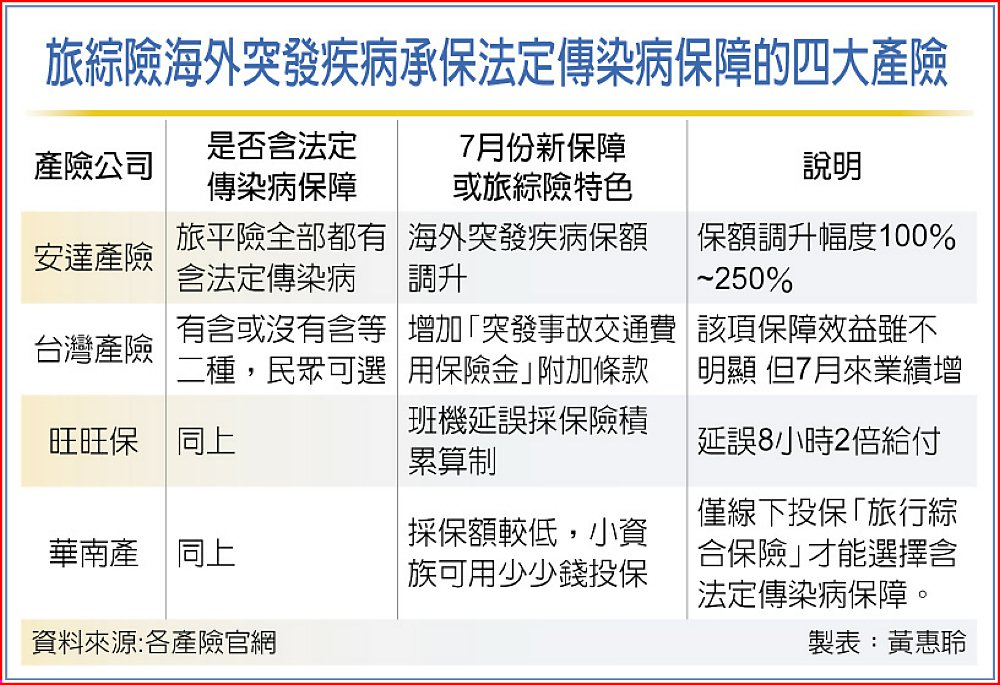 目前國內只有四家產險海外突發疾病險中有含法定傳染病保障,其中美商安達的海外旅平險保障皆含法定傳染病海外突發疾病的醫療保障;至於國內三家產險包括旺旺保、台產及華南產等海外旅綜險雖承保法定傳染病,但三家產險則採雙軌制,民眾可以選擇有含或不含法定傳染病,含有法傳的海外旅綜險保費則相對高一點。