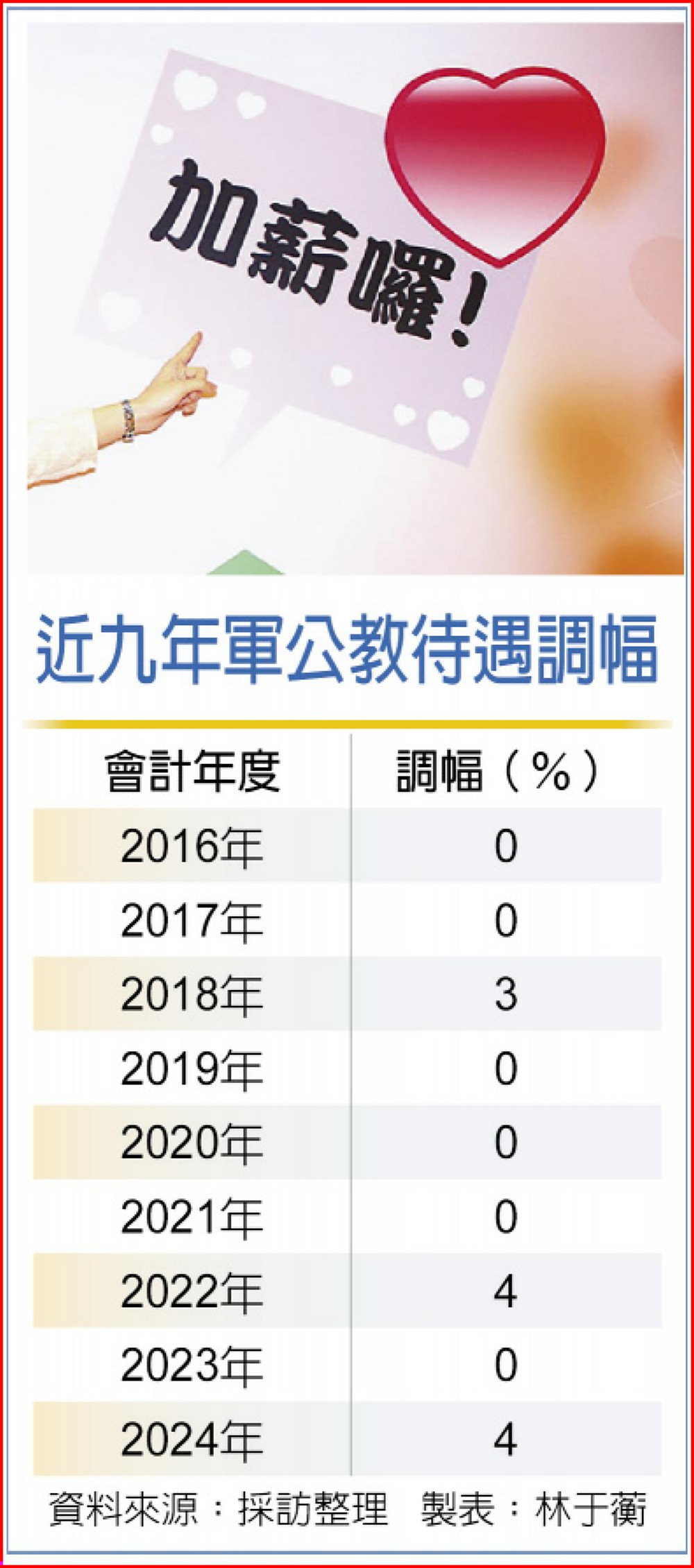 知情人士說,近年來經常性薪資雖有成長,但通膨率較高,央行預估今年會破2%警戒線,萬物齊漲,加薪幅度趕不上物價上漲幅度,軍公教人員也會抱怨加薪4%「無感」。