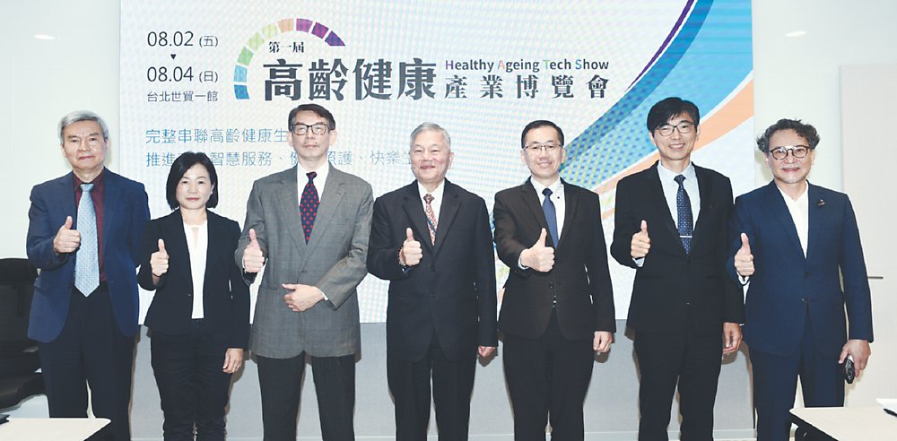 第一屆高齡健康產業博覽會即將舉行,包括國家衛生研究院院長司徒惠康(左起)、數發部數產署主秘黃雅萍、國科會科技辦公室副執秘呂佩融、生策會顧問沈榮津、經濟部產發署署長楊志清、經濟部技術司司長邱求慧等貴賓9日共同說明展出內容。圖/顏謙隆