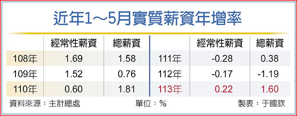 經物價指數平減後的實質總薪資、實質經常性薪資,續呈正成長1.60%、0.22%(1~4月已呈正成長),擺脫過去一、兩年的負成長陰霾。