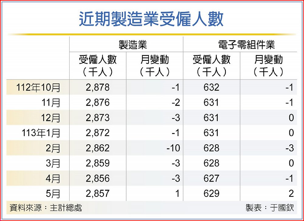 5月受僱人數除了服務業持續復甦,月增6千人,陳惠欣表示,製造業受僱人數月變動,在連續21個月下滑之後,於5月首度轉正,月增1千人,加班工時16.6小時也創近一年最高,而各界關注的電子零組件業加班工時24.5小時,也連續11個月正成長,這些數據說明製造業景氣的成長動能日趨穩定。惟觀察年變動,製造業受僱人數仍減3.6萬人,未來走勢還須觀察。