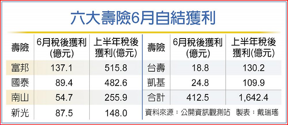 6月六大壽險全數獲利,稅後賺412億元,但因去年6月基期高,呈現年減8%。富邦人壽6月賺137億元、上半年衝破500億元居冠;國泰人壽6月賺89億元、上半年賺483億元緊追在後;南山人壽以256億元居上半年第三名;新光人壽6月獲利暴衝,以88億元拿下單月第三名,且上半年賺148億元提升到第四名;台灣人壽上半年賺130億元,凱基人壽也有110億元,六大壽險上半年全部賺超過百億元。