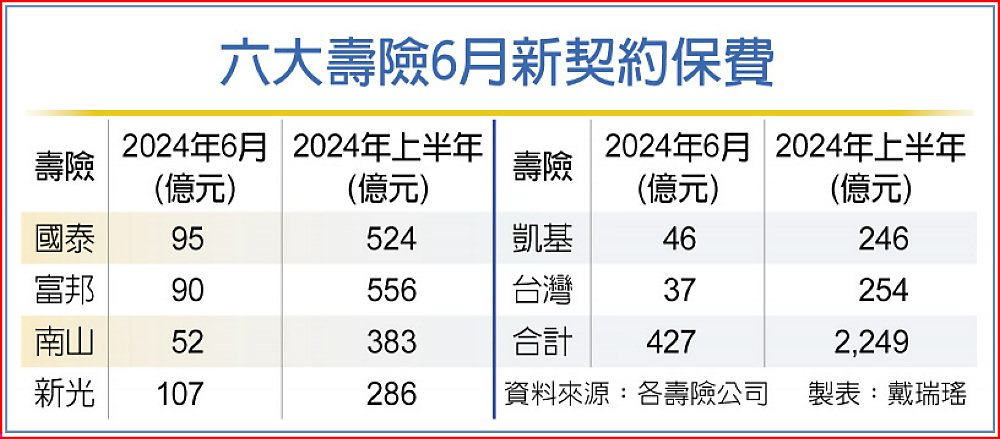 六大壽險的國泰、富邦、南山、新光、凱基與台灣等業者,6月新契約保費收入427億元,月增12%,業績明顯回升,創去年8月以來新高,也是今年新高;但因去年6月基期高,呈現年減18%。