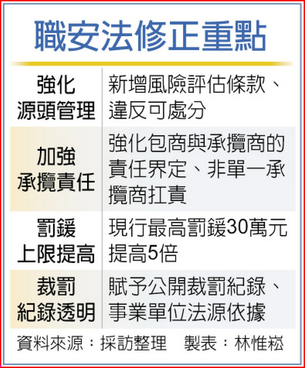 職安署署長鄒子廉說,現行罰鍰為3萬至30萬元,承攬責任罰鍰3萬至15萬元,法律嚇阻力顯然不強,對廠商來說也沒有制裁效果,加上《工廠輔導法》、《空氣汙染防制法》等法律,罰責最高上限都達到500萬左右,是有必要在此方面進行補強,考量到中小企業負荷及實務情況,下限應會維持,天花板雖還未定案但最高可訂定至5倍左右。