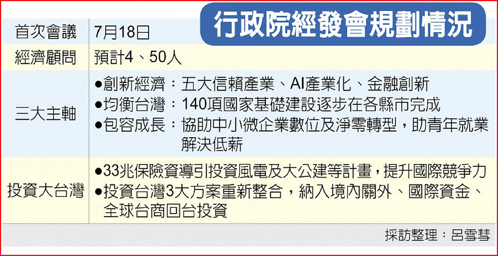 行政院18日召開的經濟發展委員會首次會議,除卓揆擔任主委,執行祕書由副院長鄭麗君及國發會主委劉鏡清出任。台灣智庫榮譽董事長陳博志、台經院長張建一、中央大學經濟系教授邱俊榮、和碩董事長童子賢等人,都被點名列經濟顧問建議名單,正式名單約50人左右待卓揆敲定。