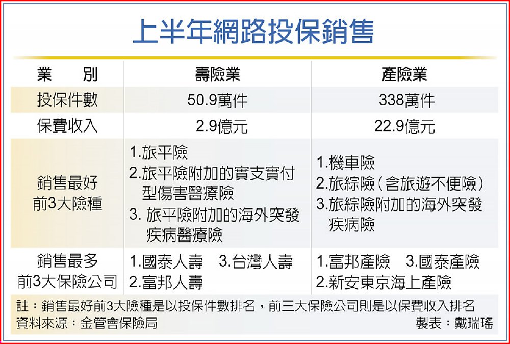 壽險業上半年網路投保件數50.9萬件、年增22%,新契約保費收入2.87億元、年增11%。銷售最好的前三大險種全是旅平險相關,上半年國人透過網路買壽險公司的旅平險達17.8萬件、0.6億元,年增11%、24%。