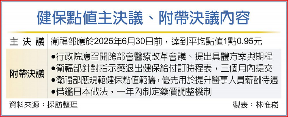 依照立法院主決議要求,為改善醫療環境,維護醫事人員專業權益,衛福部應進行健保改革具體措施,並於2025年6月30日前達到平均點值1點0.95元,以維護全國醫事人員權益。