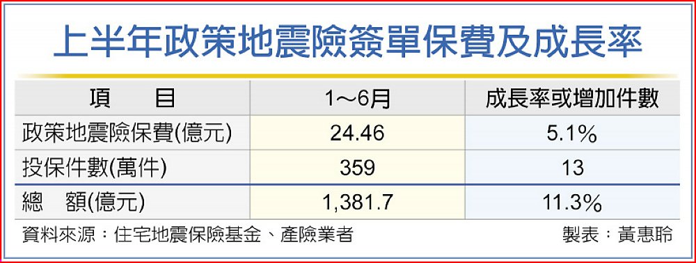 依產險業資料顯示,政策地震險每年年增率都約1.4%~1.5%左右,如2023年全年政策地震險簽單保費46.57億元,較2022年45.89億元年增率1.5%;去年上半年22.91億元,也較前年同期成長1.4%左右;今年上半年政策地震險保費成長率已來到5.1%。