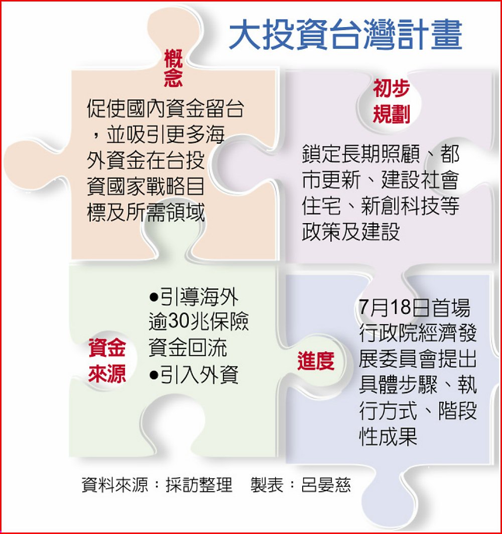 龔明鑫補充,雖然國外公債利息稍高一點,但面臨匯兌風險,在匯兌保險機制上,一年要付出好幾千億元成本,因此,卓揆希望引導保險資金回到國內,加上外資,是該計畫兩大資金來源。