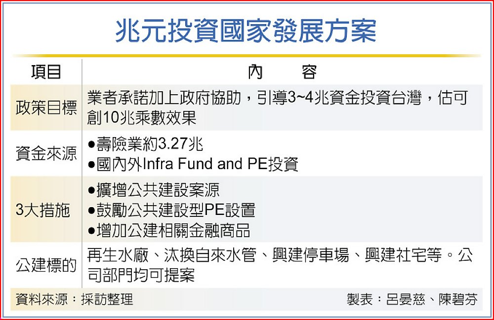 根據規畫,此一院級跨部會的投資建設推動平台,透過擴增公共建設案源、鼓勵公共建設型投資基金(PE)設置、增加公建相關金融商品三項措施,達到減輕財政負擔的效果,民間也可因此獲得優質投資標的,並降低匯兌風險。