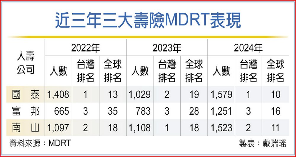 三大壽險業務員競拚「百萬圓桌」(MDRT)資格,今年成績出爐,國泰人壽、南山人壽、富邦人壽MDRT業務員人數都逾千人。圖/本報資料照片