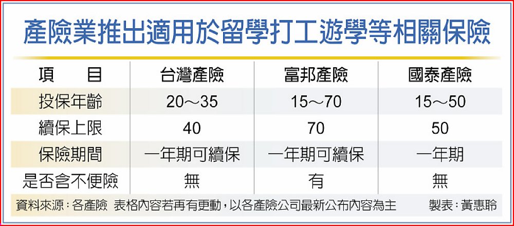 目前數家產險如國泰產、富邦產、台產等都有推出海外留學遊工打工專案,提供海外打工度假及遊、留學生需求的保險商品。