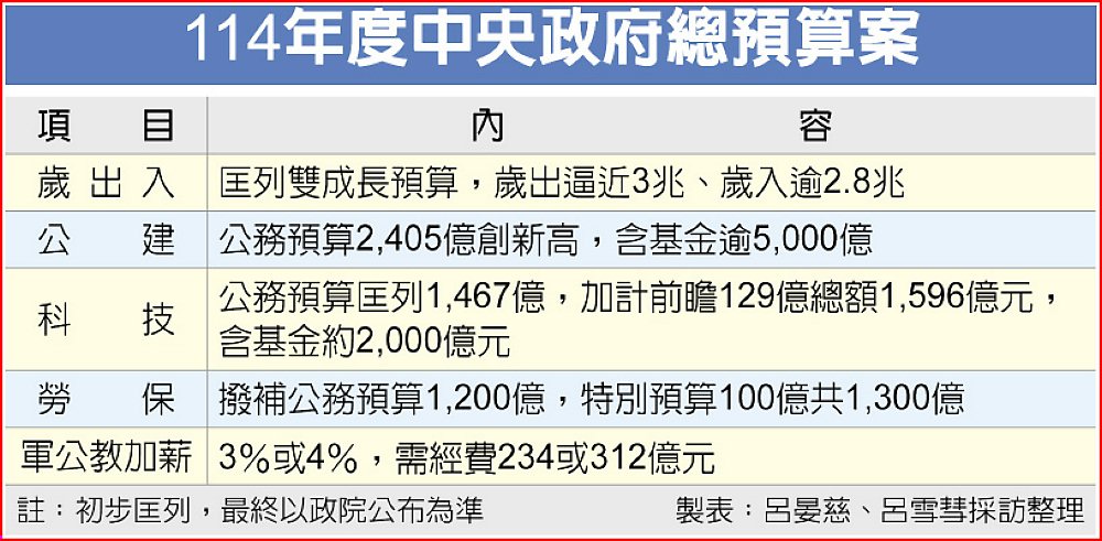 除此,114年度國防、社福、教育、經濟都會有所成長,而行政院追加歲出預算1,000億元撥補台電案仍在立法院待審中,明年度歲出規模是以立法院審定數2.85兆元作為籌編基礎,並未加入台電1,000億元,明年歲出規模預估逼近3兆元,若加上台電千億預算勢破3兆元。