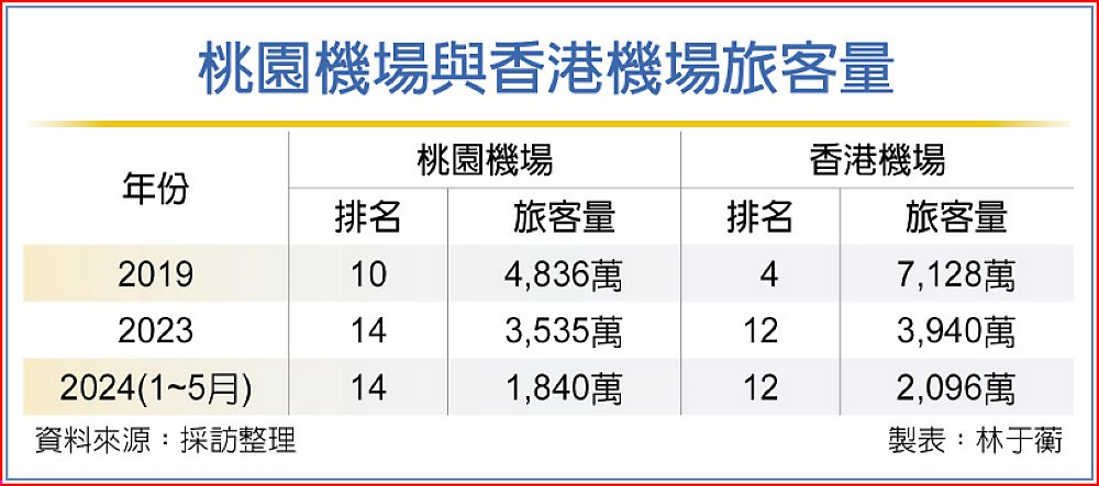 事實上,去年桃機旅運量3,535萬人次,已直逼香港3,940萬人次,觀察今年前五月旅運表現也延續態勢,桃機1~5月共1,840.5萬旅運人次,緊追香港2,096.2萬人次,可看出桃機與香港的差距已明顯縮短,即便香港總量仍高於桃機,但香港在全球機場運量總排名已不比從前,與台灣僅剩1名次之差。