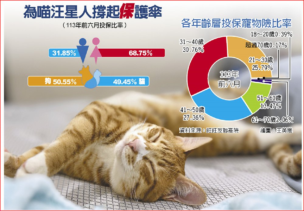 據旺旺友聯產、國泰產以及富邦產等統計各家實際投保寵物險案例統計,20歲至40歲投保寵物險的占比都在50%~60%,有的甚至高於60%。依旺旺友聯產險資料進一步分析,若再加計40~50歲投保件數,20~50歲投保占比已逾8成;另外,男性和女性投保比例來看,女性投保寵物險占比甚至是男性投保的2倍。