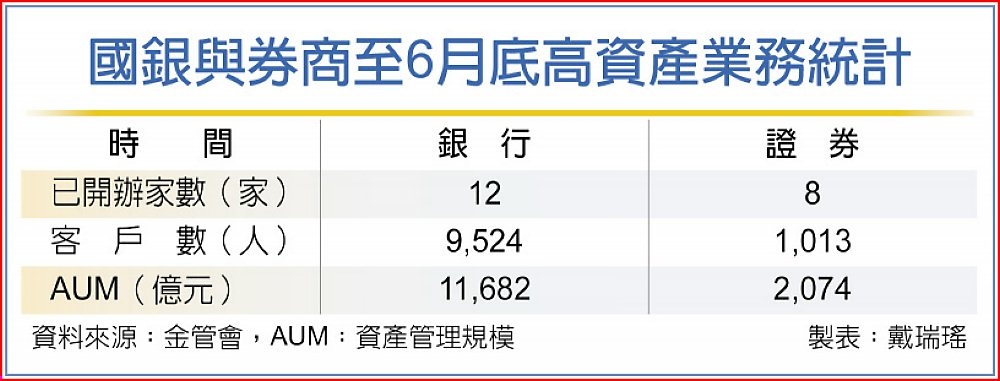 證券商高資產業務部分,上半年客戶數破千人大關,八家開辦券商累積客戶數達1,013人、年增40%;累計交易金額破2,000億元至2,074億元、年增95%。至6月底前三大券商排名未變動,永豐金證以1,101億元續居冠軍,也是首家破千億元,年增率達1.4倍;亞軍國泰證527億元、年增率超過4成;兆豐證以253億元拿下第三名,年增率近6成。