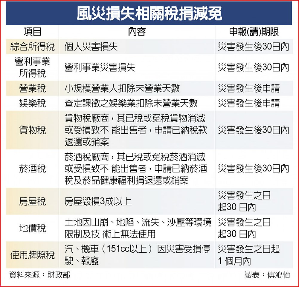 地方稅的部分,民眾或商家如因強風豪雨造成財產損失,符合減免標準,可於災害發生日起30日內申請減免房屋稅、使用牌照稅及娛樂稅;地價稅的部分則是在9月22日前申請即可。
