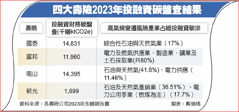另根據四家大型壽險的永續報告書揭露,去年底投資部位進行碳盤查後,投資組合中碳排放量占比最高屬石油與天然業,占比有的可高達4成,其次是電力供應業、主要是燃煤業,約有1成以上。
