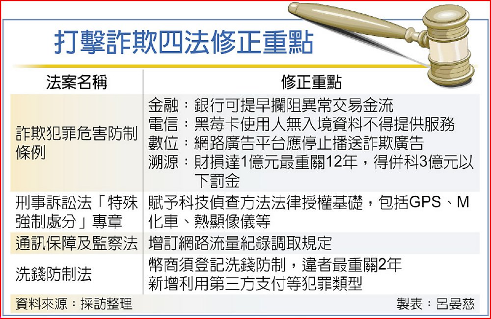 為完備打詐法制,立法院趕在休會前三讀通過《詐欺犯罪危害防制條例》、修正《通訊保障及監察法》、《洗錢防制法》與《刑事訴訟法》,將幣商納入管制,並避免第三方支付淪為洗錢管道。據了解,行政院會原擬於25日討論打詐措施,但因雙北停班課將順延至下周。