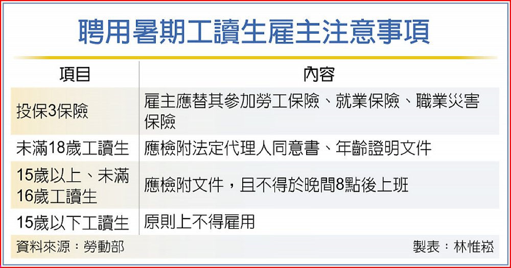 勞動部並指出,若僱用未滿18歲青年,應備有「法定代理人同意書及年齡證明文件」;若是15歲以上、未滿16歲以上童工,不得於晚間8時至翌日6時夜間時段工作。未滿15歲的孩童,原則上不得受僱,除非已經國中畢業或工作環境無礙身心健康,且經過勞工主管機關許可,才不在此限。