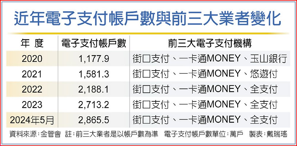 近年電子支付帳戶數與前三大業者變化