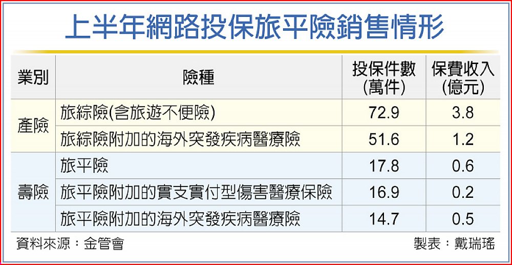 就投保件數來看,上半年產險業線上賣的旅綜險(含旅遊不便險)就高達72.9萬件、年增71%,壽險業的旅平險也賣17.8萬件,也年增11%,等於整體保險業光是旅平險與旅綜險就有90.7萬件之多。