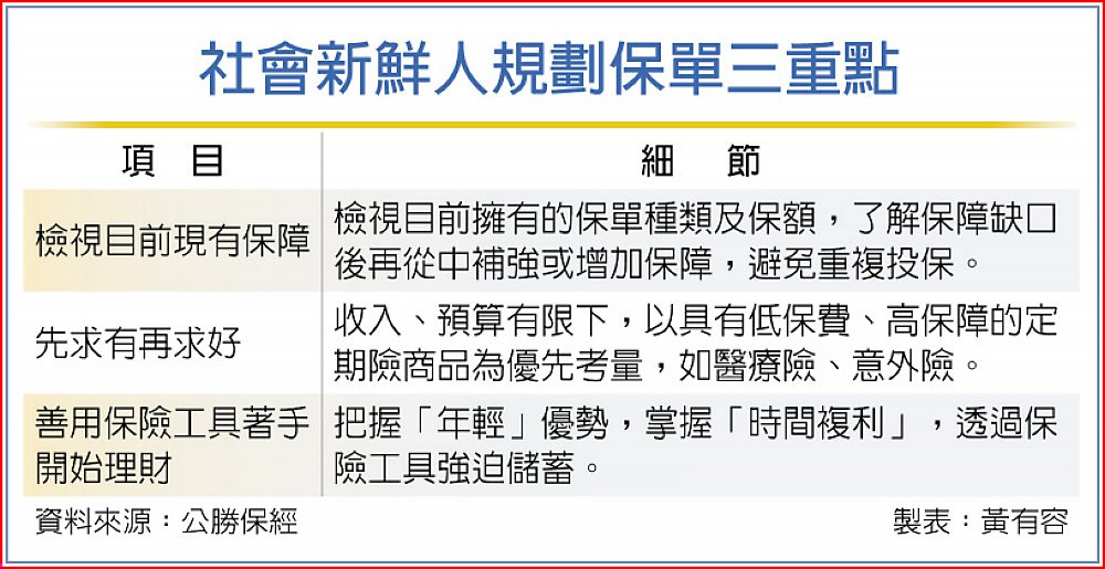 公勝保險經紀人資深行銷總監李雁如指出,許多新鮮人多半仰賴父母過去幫忙建構保險保障,普遍缺乏保險觀念。因此,她建議新鮮人在規劃投保時,可先掌握三大重點原則。